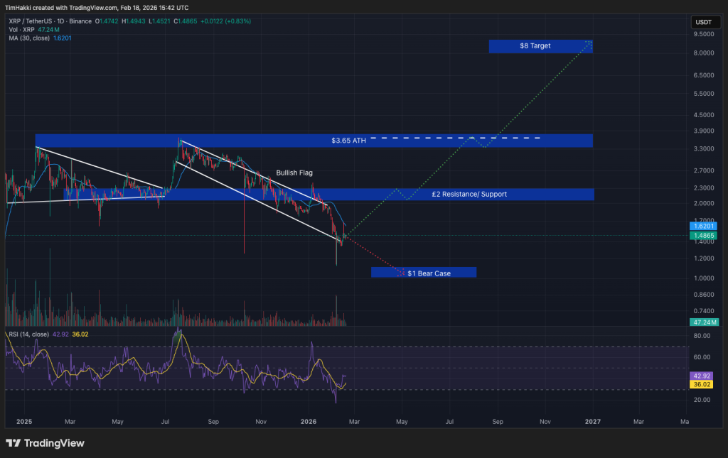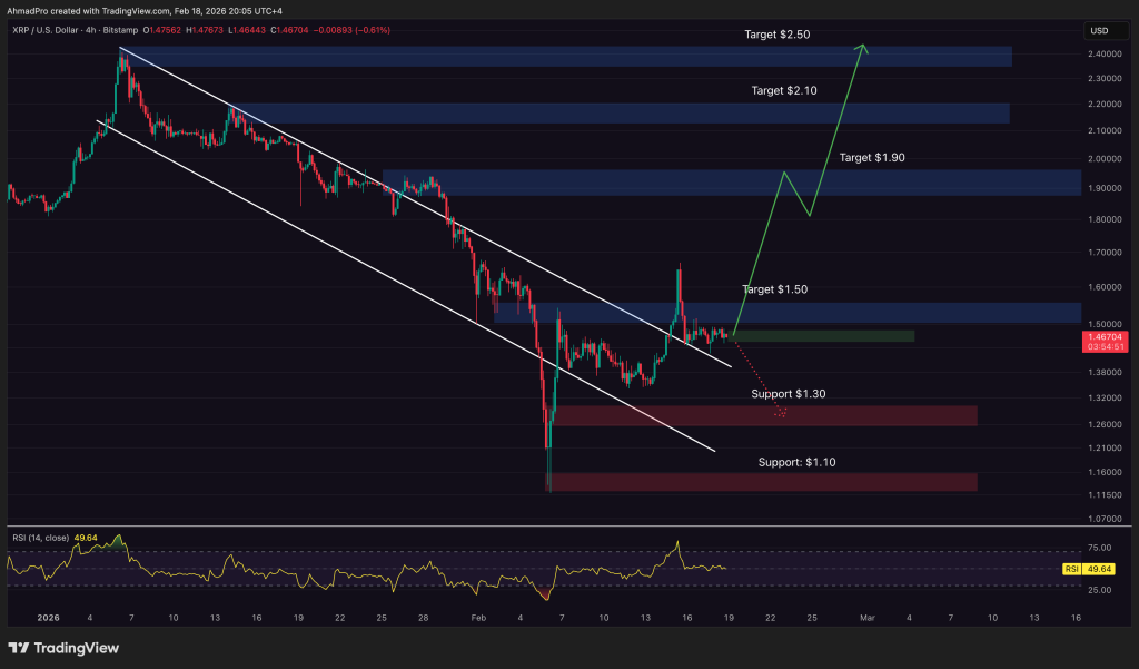 XRP price is sprinting. Since the February 6 low, the token has ripped about 38% to $1.55.