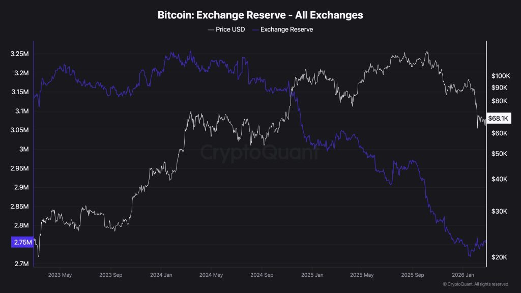Exchange reserves are deepening their multi-year downtrend. Coins are moving off exchanges into cold storage, a signal that usually precedes supply shocks.